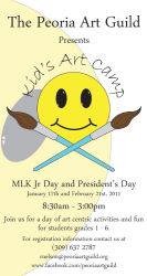 The Peoria Art Guild will host Kid’s Art Camp Days during single-day school holidays. Students are divided into two groups (grades 1-3 and 4-6) to experience a day of art-related projects including “Abstract Collage,” “Art and Culture,” “Music, Color and Art,”